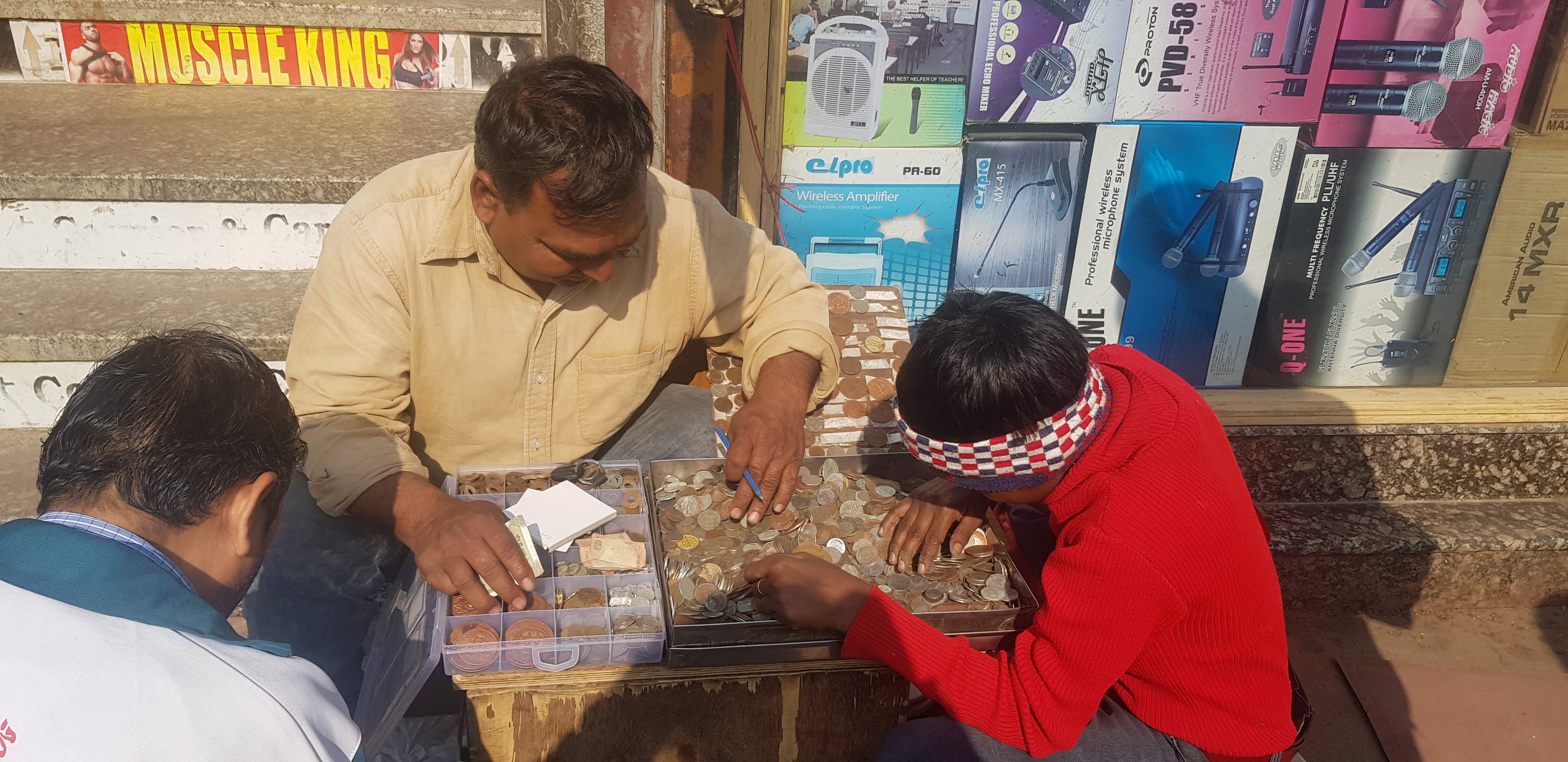 This man earns his living by selling coins.